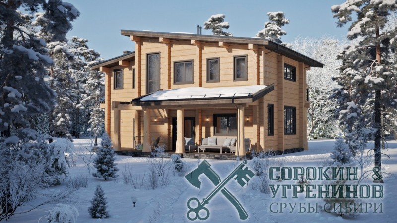 Индивидуальный проект дома из лафета с элементами каркасных столбов и балок Post&Beam, столбы и балки выполнены из бревна диаметром 460мм, стены из лафета 250х400мм. Общая площадь дома 256м2. Высота потолков 4 метра, большие витражные французские окна в пол в гостиной на первом этаже, пологая крыша односкатная, балкон на две стороны.
