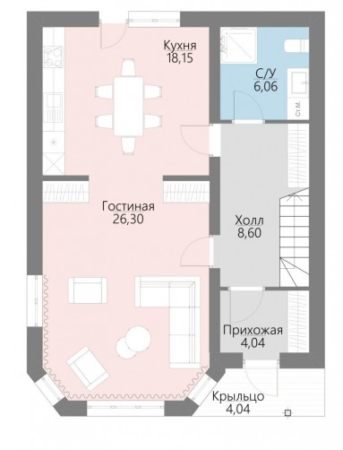 Главной особенностью данного проекта является гостиная с эркером площадью 26 кв.м., которая станет центральным местом для семейных вечеров или приема гостей. Любой хозяйке придется по душе большая и просторная кухня 18 кв. м., а если она ещё и совмещена со столовой, то процесс приготовления пищи превращается в настоящее удовольствие, поскольку имеется возможность разместить любую технику и поставить большой обеденный стол.