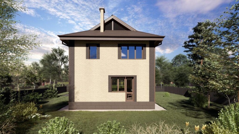 Проект двухэтажного жилого дома с эркером общей площадью 130 квадратных метров — эклектика классической элегантности и современных строительных материалов.